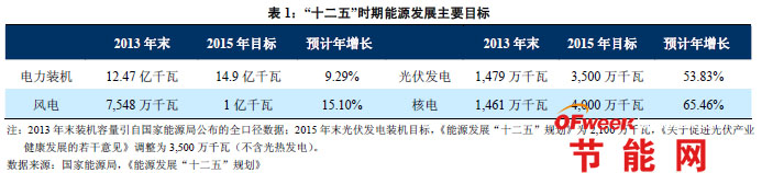 根據(jù)能源發(fā)展“十二五”規(guī)劃,到2015年我國電力裝機容量將達到14.9億千瓦,其中,風電、太陽能和核電的裝機容量分別達到10,000萬千瓦、3500萬千瓦和4000萬千瓦。