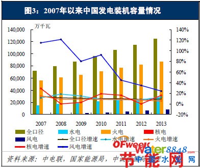 “十二五”期間,我國發(fā)電機組的總裝機增速呈下降趨勢,增速由2008年末的11.28下降至2013年的9.3%,而新能源因其清潔,可再生等優(yōu)勢,得到了國家政策上的大力支持,整體裝機增速明顯高于全國發(fā)電機組的總裝機增速,寫在我國電源結(jié)構(gòu)中的占比逐年提升。