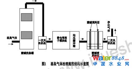 治理惡臭廢氣的核心技術是靜電等離子廢氣治理技術,輔助技術是酸堿洗滌技術和生物膜過濾技術,見圖1。