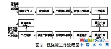 4.1惡臭廢氣從洗滌罐的底部進入罐體,先經(jīng)過酸液生物膜填料層洗滌,經(jīng)過洗滌,惡臭廢氣中的堿性成份被吸收;