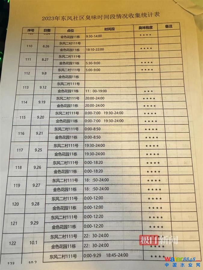 金色花苑小區(qū)和東風(fēng)二村111號(hào)的居民們用表格記錄了臭味的時(shí)間,極目新聞?dòng)浾叻喛吹剑涗洺粑兜臅r(shí)間段大多是在夜間。