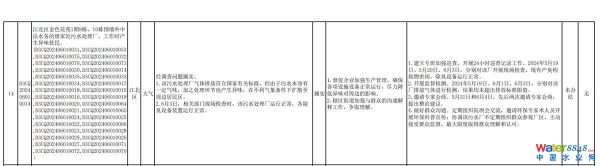 處理和整改情況顯示為,一是建立專班加強(qiáng)巡查,開(kāi)展24小時(shí)巡查記錄工作。2024年5月19日、5月20日、6月3日,分別對(duì)該廠開(kāi)展現(xiàn)場(chǎng)檢查,現(xiàn)有產(chǎn)臭構(gòu)筑物密閉,除臭設(shè)備運(yùn)行正常。二是開(kāi)展監(jiān)督檢測(cè)。2024年5月19日、6月1日、6月3日,分別對(duì)該廠排放氣體進(jìn)行檢測(cè),結(jié)果均未超出排放標(biāo)準(zhǔn)限值。三是邀請(qǐng)專家會(huì)商。5月31日和6月4日,先后兩次邀請(qǐng)專家會(huì)商,提出整治建議。四是做好群眾溝通。定期組織院壩會(huì)交流,邀請(qǐng)環(huán)保專家技術(shù)人員開(kāi)展環(huán)?破招麄鳎粎f(xié)調(diào)該污水廠不定期組織群眾參觀廠區(qū),主動(dòng)接受群眾監(jiān)督,最大限度取得群眾理解和認(rèn)可。