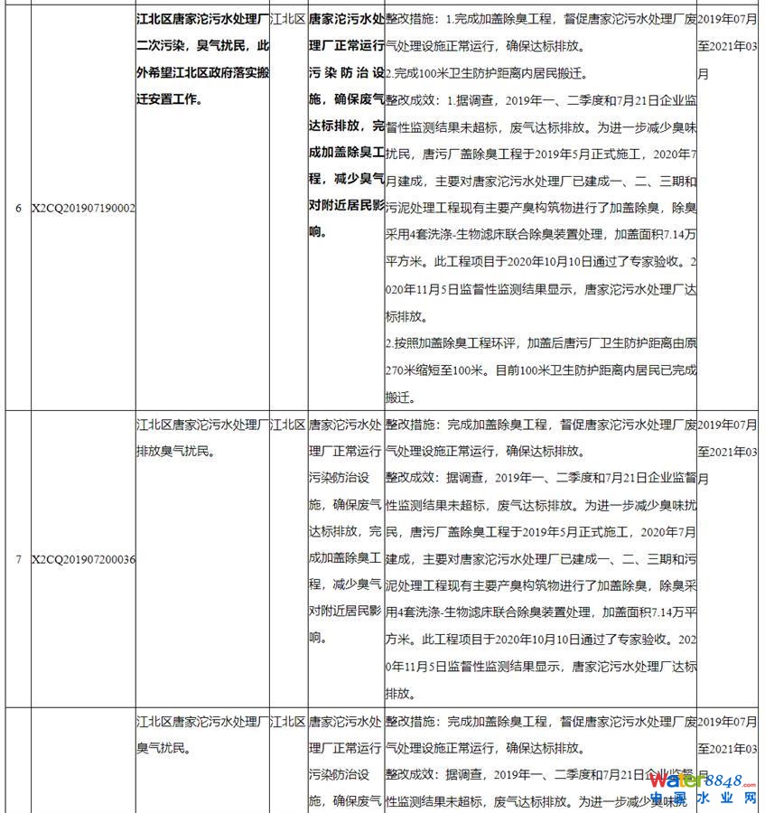 2021年3月30日,重慶江北區(qū)政府官網(wǎng)公布的《第二輪環(huán)保督察群眾舉報(bào)投訴問(wèn)題整改銷號(hào)第二批情況公示》顯示,針對(duì)群眾投訴的唐家沱污水處理廠臭氣擾民情況,整改成效為:唐污廠加蓋除臭工程于2019年5月正式施工,2020年7月建成,主要對(duì)唐家沱污水處理廠已建成一、二、三期和污泥處理工程現(xiàn)有主要產(chǎn)臭構(gòu)筑物進(jìn)行了加蓋除臭,除臭采用4套洗滌—生物濾床聯(lián)合除臭裝置處理,加蓋面積7.14萬(wàn)平方米。此工程項(xiàng)目于2020年10月10日通過(guò)了專家驗(yàn)收。2020年11月5日監(jiān)督性監(jiān)測(cè)結(jié)果顯示,唐家沱污水處理廠達(dá)到了排放標(biāo)準(zhǔn)。按照加蓋除臭工程環(huán)評(píng),加蓋后唐污廠衛(wèi)生防護(hù)距離由原270米縮短至100米,目前100米衛(wèi)生防護(hù)距離內(nèi)居民已完成搬遷。